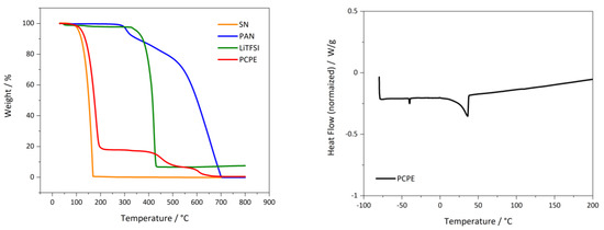 From DSC experiments (Figure 1 left), two distinctive endothermic events upon heating from −80 °C to 200 °C were observed. The first endothermic peak at −41 °C (ΔHpc 1–2 J/g) is attributed to the solid-solid phase transition of SN in the PCPE, from crystalline to plastic crystalline (Tpc) [16,20]. The second endothermal signal at 42 °C (10 J/g) is attributed to the melting of the PCPE [20]. The observed transition temperatures were lower compared to pristine SN, but are in good agreement with values reported previously for similar systems [20]. Further TGA experiments (Figure 1—right) demonstrated, that the PCPE loose up to 3 wt.% until 114 °C due to sublimation of SN [31].