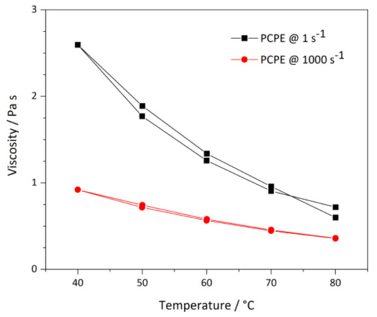 In a melted phase, the PCPE exhibited a viscosity dependence on temperature and shear rate (Figure 2). Raising the temperature lowers the viscosity at 1 s−1 from 2.5 Pa s (40 °C) to 0.6 Pa s (80 °C). Additionally, increasing the shear rate to 1000 s−1 decreased viscosity to 0.9 Pa s (40 °C) and 0.4 Pa s (80 °C).