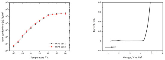 (Left): Arrhenius graph derived from impedance spectroscopy of PCPE infiltrated separator (PCPIS) between −40 °C and 80 °C vs. steel electrode; (Right): Linear voltage sweep of PCPIS vs. lithiated graphite with 1 mVs-1; here shown a representative curve of three measured cells.