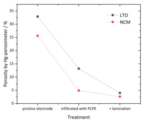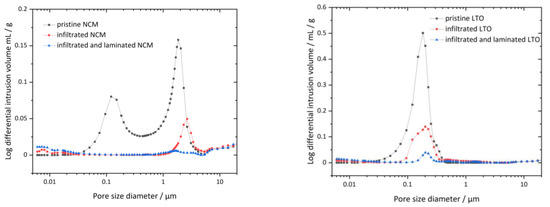 Hg-porosimetry measurements are used to verify PCPE penetration into pores of the LTO and NCM electrodes. Through the hot-isostatic infiltration process, the PCPE is being pressed into the porous structure and is presumed to fill the open porosity of the electrodes. Using the Hg-porosimetry method we aim to detect the difference in the pore volume before and after the infiltration and subsequent lamination process of the electrodes. Therefore, the differential intrusion volume of the not infiltrated NCM and LTO electrode is compared with the PCPE infiltrated and the isostatic laminated electrode. Note that the Hg-porosity measurement device is not able to detect pores smaller than 6 nm or to discover closed porosity or cavities. In addition, in the data evaluation only pores of 10 µm and smaller were considered for the porosity calculation, as larger pores are attributed to measurement artefacts which arise from the surface of the sample. Moreover, we could not detect pores larger than 10 µm diameter neither in used LTO nor in NCM electrodes in the FESEM pictures (see Section 3.3). Hence, the intruded mercury volumes in a pressure range >18 psi were not considered. These two recalculation steps are necessary to determine the calculated porosity.