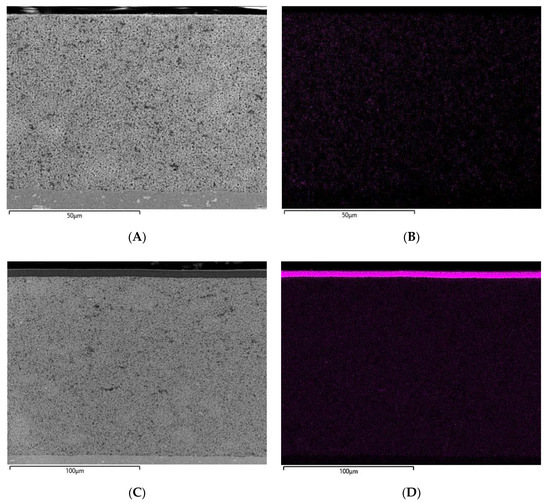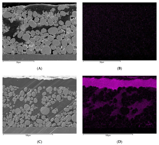 FESEM cross-section (SE-detector) prepared by focused ion beam of: (A) sample of pristine NCM without PCPE; (B) EDS mapping of sulfur in pristine NCM (control sample); (C) infiltrated and laminated NCM sample with PCPE; (D) EDS mapping of sulfur in infiltrated and laminated NCM.