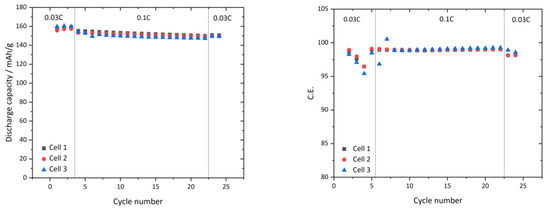 For evaluating the C-rate and cycle capacity, full cells with infiltrated and laminated NCM and LTO were assembled and measured with 0.03C at 45 °C for 3 cycles, subsequently for 12 cycles at 0.1C and finally at 2 cycles at 0.03C. Figure 8 left shows the capacities of 3 identically prepared and measured cells. We noticed a high initial discharge capacity at 0.03C ranging from 155 to 160 mAh/g and after 20 cycles at 0.1C a capacity ranging from 147 to 150 mAh/g. The final two 0.03C cycles show discharge capacity values between 148 and 150 mAh/g. Figure 8 right shows the coulombic efficiency, which is between 95.4% and 98.8%, indicating that charge capacity is slightly higher. The following 0.1C cycles show a coulombic efficiency between 96.8% and 99%, decreasing to 98% at the last two 0.3C cycles. The loss in coulombic efficiency in the beginning might be attributed to an electrolyte side reaction. Regarding the fact that the used NCM622 is limiting the electrode to 165 mAh/g, a practically achieved capacity at 0.03C of 160 mAh/g (97% of the possible capacity) indicates that the PCPE percolation in the electrode is sufficient for lithium conductive network. This supports the data revealed by Hg-porosimetry, where only 2.6% was not infiltrated by the PCPE. This shows that a solid-state battery with PCPE can be assembled in a full cell configuration and cycled at 0.03C and 0.1C. To visualize the difference between charge and discharge capacity, voltage-capacity curves of cell 1 in Figure 8 left were extracted and shown in Figure 9.