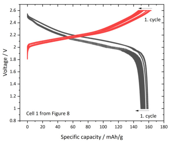 Extracted capacity voltage curves of full cell 1 from Figure 8; red: charge curve; black: discharge curve.