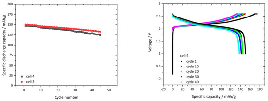 In Figure 10—left, the cylcing performance of two cells cycled at 0.1C for 40 cycles is shown. The voltage-capacity curves of cell 4 (black dotted) were extracted and displayed in Figure 10—right. We observe an initial discharge capacity of 146 mAh/g (cell 4) and 150 mAh/g (cell 5), which declines to 132 mAh/g (cell 4) and 124 mAh/g (cell 5), respectively, after 40 cylces. The capacity loss shows a linear behavior. The voltage capacity plot in Figure 10—right shows a high initial charge capacity of 174 mAh/g. We can conclude that the extended cylcing test give promising results about a long term cyclability, but show a capacity degradation, which has to be examined and remedied. A possible reason for the capacity loss might be reductive or oxidative (or both) reactions of the PCPE, which accumulate over the cycles and thus lead to an accumulating layer on the acitve material, which reduced the capacity. As half cell measurements were not conducted, the origin can currently not be distinguished. We believe that at 2.6 V vs. LTO electrode in the full-cell, minor reactions could occur at the NCM. This can be supported by the LSV measuremt (Figure 3—right), which shows at 4.2 V vs. lithiated graphited a beginning oxidative current. As Figure 8 right shows a decreased in coulomb efficiency in the first cycles at 0.03C, compared to the following cycles, occurs, which can indicate a reaction at the PCPE. Further work is planned to clarify the origin of the capacity loss and if electrochemically induced oxidative reactions occur in the PCPE.