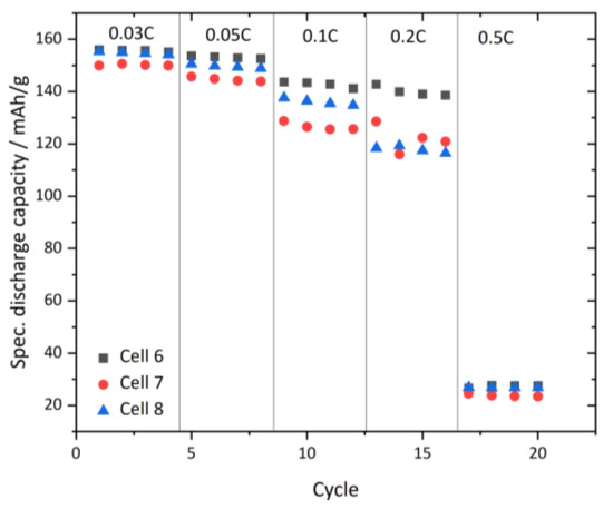 Figure 11 shows full cell tests at different C-rates with infiltrated and laminated NCM/LTO electrodes cycled at 45 °C. Supplementary Table S1 shows the median capacity values with its standard deviation of the measured cells in Figure 11. We can observe a high discharge capacity of 153 and 149 mAh/g with a low deviation at 0.03 and 0.05C. When increasing the C-rate to 0.1C or 0.2C, we can see a drop in mean capacity values to 135 ± 7 and 126 ± 10.5 mAh/g. When further increasing the C-rate to 0.5C, we observe a massive capacity drop to 25.9 ± 1.7 mAh/g. This may be due to several reasons, including diffusion limitation within the individual battery components (both electrodes or electrolyte). We can conclude that the here presented battery with a PCPE is able to give high reliable capacity values at 0.03C, 0.05C and 0.1C. However, for more detailed information on high current rate performance, more in-depth analysis is necessary. For future works we propose the following optimization, to achieve higher capacity and a higher infiltration degree: Firstly, an improved NCM cathode, with a large skeleton density, larger NCM granuels and less and better distributed carbon black in order to maintain good accesible porosity. In addition, we propose a lowered viscosity of the PCPE, specially designed for the LTO infiltration. Moreover, multiple infiltration steps could contribute to a higher degree of infiltration, which might also be possible with low viscous PCPE. Thirdly, the separator infiltration process might be also improved by a vacuum infiltration, which are currently ongoing investigations.