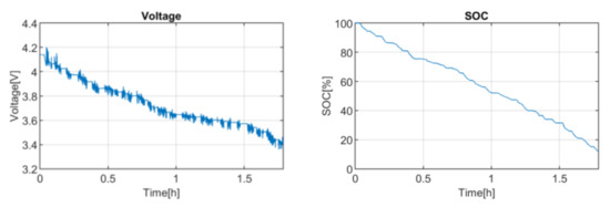 The resultant testing input was run on the selected cell in a climatic chamber at 25 °C, thus emulating the real operation of the high-power electric bus. As for the initial condition, the battery was charged to 100% SOC. The voltage response and SOC evolution is shown in Figure 2.