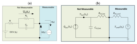 The applied battery model describes the electric and thermal behaviour of the chosen battery. It is assumed that the scale up from the battery/cell level to the battery system is trivial and that the interactions between cells are negligible. The developed electric [24] and thermal models [25] are shown in Figure 3.