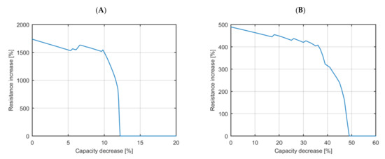 The observed results in Figure 4A show that the EOL event of the high-energy EV application is not reached with a capacity decrease up to 10% unless there is a resistance increase higher than 1500% (a 16 times bigger resistance than the initial one). Between capacity decrease values from 10 to 12.2%, the resistance increase that describes the EOL event decreases drastically from 1400 to 0% (to the resistance at the beginning of life). Batteries with capacity decrease values from 12.2% onwards cannot be used for this application.