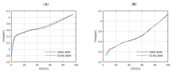 The first hypothesis states that the polarization voltage and OCV does not change significantly with the increase of the pure ohmic resistance. To validate this, firstly, the OCVs of a fresh and of an aged cell were compared (Figure 5). The relative capacity was considered to be the SOH itself. The aged and fresh cell have slightly different OCV profiles.