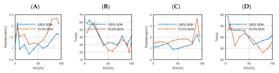 Secondly, the parameters that define the polarization impedance (the polarization resistance and the polarization time constant) of a fresh and an aged cell were compared (Figure 6). The fresh and the aged polarization impedances have values of the same order. There are significant changes in some specific SOC values due to the degradation but also due to the uncertainty of the applied estimation process. However, all the values are between similar upper and lower boundaries, which suggests that the use of the polarization impedance values estimated on a fresh cell will not have a significant impact when simulating the voltage response of the aged cell using the polarization impedance values estimated at fresh state.
