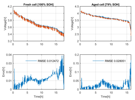 Thirdly, the correctness of the proposed model representing the behaviour of an aged battery with the measured OCV and polarization impedance values at fresh state is tested, see Figure 7. The simulated aged cell voltage profile has a root mean square error (RMSE) of 0.028 V and the simulated fresh cell voltage profile has a RMSE of 0.012 V. There is a relevant difference in the committed errors, but on both cases the committed RMSE is below 30 mV, which is low enough to consider the proposed model accurate [24].