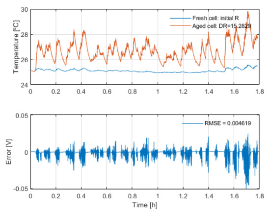 The third hypothesis states that the change in the heating of the cell due to the resistance increase does not significantly affect the voltage response of the cell. This hypothesis is applied only to the high-energy application use case and it is tested by simulations of the thermal and electric response of that high-energy battery with the obtained resistance increase, see Figure 8.
