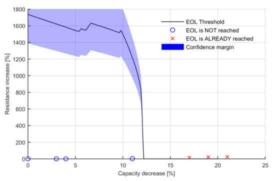 A downscaled power profile was applied to each of those seven batteries at a fully charged state. The test was conducted in a climatic chamber set at 25 °C. The batteries that had already experienced the EOL event were identified by checking that the battery was not able to complete the downscaled power profile without reaching the end of discharge voltage. The observations were added to the calculated EOL threshold, see Figure 9.