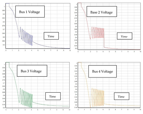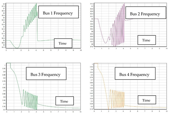 The bus voltages of all buses drop far below 1 pu after 10 s of simulation time. There is a sudden overshoot of bus voltages at around 4.2 s and after that the bus voltages drop drastically, which is shown in Figure 15. Figure 16 shows the variation of rotor angles and generated powers of generators at buses 1 and 2. The rotor angle, generated voltage, and generated power of the generator connected to bus 2 drops far below the steady state value, which is near to zero at 3.6 s, which causes shutdown of that generator. The bus frequency also overshoots at around 4.2 s and increases beyond the steady state system frequency of 60 Hz. After 4.2 s, the bus frequency drops sharply to 60 Hz and retains that until the end of the simulation, which is seen in Figure 17. When the generator at bus 2 shuts down, then the generator connected to the slack bus supplies power to the load of the 7-bus system by keeping the system frequency to 60 Hz. In order to retain the system frequency at 60 Hz, the rotor angle of the slack generator increases after oscillation and gradually cuts down the load of load buses. Though the system becomes unstable, the slack generator supplies power below its maximum generated power to the reduced system load for retaining the system frequency at 60 Hz.