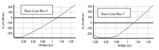 Q-V (Reactive Power Voltage) curves of buses 5 and 7.
