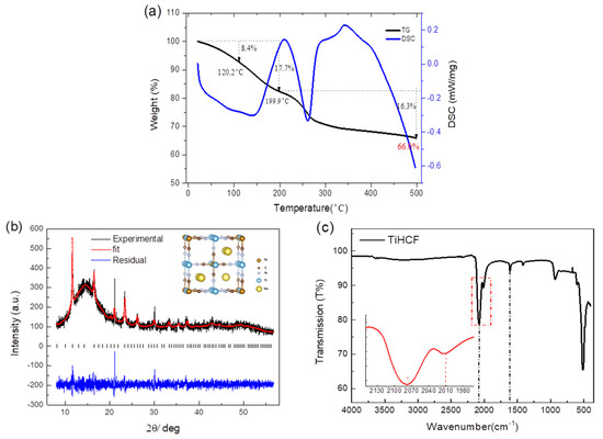 (a) Thermogravimetric analysis (TGA) of TiHCF powder and the crystal structure model (inside); (b) X-ray powder diffraction (XRPD) pattern and Rietveld refinement on TiHCF powder. The broad peak at around 10–17 degrees is due to the capillary sample holder; (c) infrared transmission spectrum of TiHCF powder.