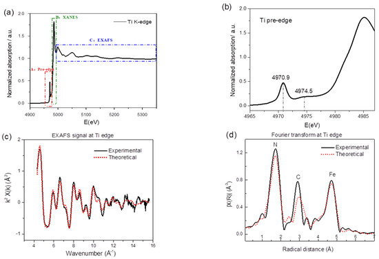 X-ray absorption spectroscopy (XAS) is a widely used technique for determining the local geometric and/or electronic structure of the absorbing atom. Figure 2a displays the titanium K-edge spectrum regions—i.e., the pre-edge (labeled as A), a feature B in the rising portion of the X-ray absorption near edge structure (XANES), and the EXAFS region (extended X-ray absorption fine structure), indicated as C. Absorption in the pre-edge region is due to transitions of 1 s core electrons to bound excited electronic states, providing a wealth of structural and electronic information. As shown in Figure 2b, one appreciable peak at around 4970.9 eV and one broad peak at around 4974.5 eV are present. Howe et al. [43] reported three pre-edge peaks in anatase (TiO2) Ti K-edge and labeled them as A1 (4968.8 eV), A3 (4971.9 eV), and B (4974.3 eV); Kuroda et al. [44] and Kotani et al. [45] also reported the A1, A2, and B peaks in the rutile and anatase Ti K-edge. Even though there is some disagreement in the value of the absolute edge energies, there is a general consensus that all A and B transitions are due to dipole forbidden transitions of the core electrons to 3d-4p hybridized states. Given that the intensity of the pre-edge transition is sensitive to the symmetry of the surrounding atoms and that here, Ti is coordinated to 6 nitrogen atoms, the appearance and the relatively high intensity of the pre-edge peaks indicate distortion from the Oh symmetry.