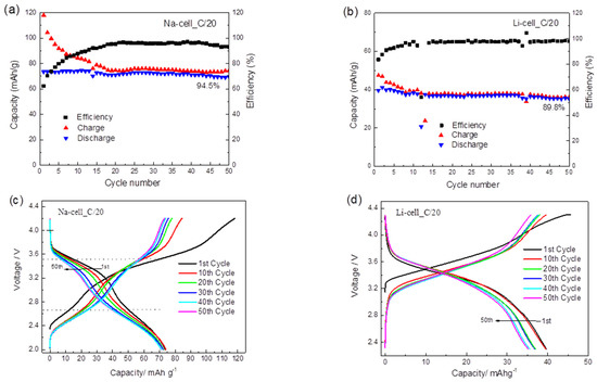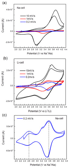 Cyclic voltammetry (CV) was performed by means of CHI 660 (CHInstrument, Inc.). The scan was conducted in the potential range of 2.3–4.3 V vs. Li+/Li or 2.0–4.2 V vs. Na+/Na. An MTI battery analyzer was employed for galvanostatic cycling, and tests were started after a rest time (6 h) at OCP condition. Cells were tested at room temperature.