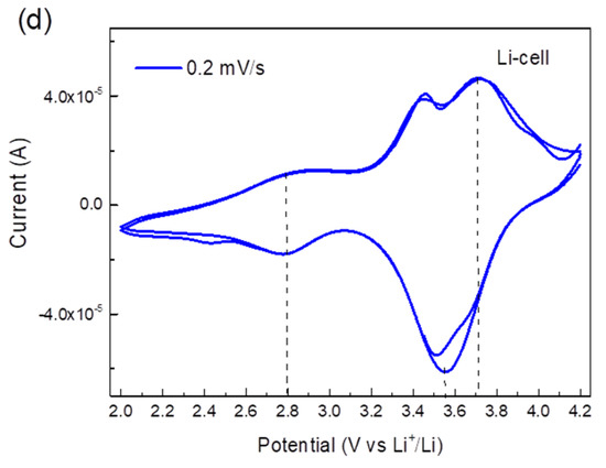 On the other side, for the Li coin cell (cf. Figure 4d), only one sloping discharge plateau was observed, with a lower discharge capacity (40 mAh g−1 in the first cycle) compared to the Na coin cell. The difference in the insertion chemistry for the Na+ vs. Li+ is relevant, as there are not so many examples in the literature where the same electrode material displays higher performance upon Na storage than Li storage [24]. It is most likely that the Na+ extraction in the first charge, coming from the sodium inside the pristine structure, does not favor the successive Li+ ion insertion and release in Li cells. On the contrary, the sodium release/insertion occurs more easily in Na cells.
