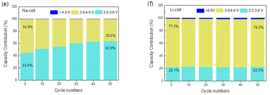 (a) Cycling performance of a Na-ion half-cell at C/20 between 2.0–4.2 V; (b) cycling performance of a Li-ion half-cell at C/20 between 2.3–4.3 V; (c) galvanostatic charge/discharge plot of a Na-ion half-cell at C/20; (d) galvanostatic charge/discharge plot of a Li-ion half-cell at C/20; (e) the corresponding discharge capacity contribution of different voltage range in a Na-ion half-cell after various cycles at the C/20; (f) the corresponding discharge capacity contribution of different voltage range in Li-ion half cell after various cycles at C/20. The applied current densities are 0.0061 mA/cm2 for Na cell and 0.0056 mA/cm2 for the Li cell.