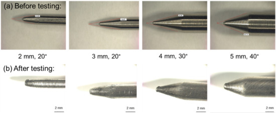 Representation of the nail geometries used for the nail penetration of lithium-ion batteries. (a) Nails with diameters of 2–5 mm and opening angles of 20–40° before the tests. (b) Nails after the tests.