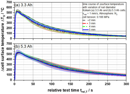 Average cell surface temperatures ΔTS as a function of the relative test time trel,T of (a) 3.3 and (b) 5.3 Ah cells for different nail geometries from 2 to 5 mm.