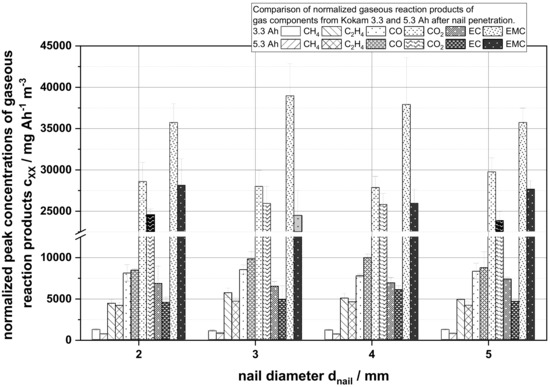 Comparison of the normalized measured peak gas concentrations cxx in mg Ah−1 m−3 in dependency of the nail diameter of the gases CH4, C2H4, CO, CO2, EC and EMC as a part of the main reactions components from the thermal runaway.