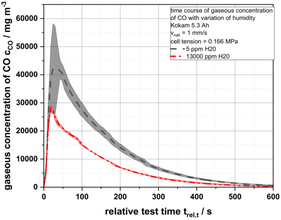 In order, to analyze the process, the drop in voltage, the temperatures generated on the cell surface and the infrared-active gases were recorded. However, it could be observed that neither the time course of the drop in cell voltage nor the surface temperatures were influenced by the changed atmospheric condition (Figures S16 and S17). To evaluate the influence of the water content on the reactions and on the products of the thermal runaway of lithium ion batteries, the compositions of the gaseous reaction products have to be analyzed. Figure 7 shows the CO concentration over time after the thermal runaway of three battery cells each for the humidity of 5 and 13,000 ppm H2O. The temporal course of both curves resembles the expected behavior with a rapid rise to a concentration maximum and an exponential decrease in CO concentration while the gas was flushed out of the test facility. However, the different maximum CO concentrations were remarkable. While the maximum concentration at 5 ppm H2O was 42,129.74 mg m−3, it reached only 28,257.94 mg m−3 at 13,000 ppm H2O.