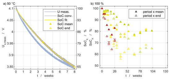 - Transferring the voltage progression into an SoC progression. Based on the OCV from the previous intermediate characterization x − 1, an SoC value is assigned to each voltage value according to Equation (2). The approach is comparable to the long-time model equations for self-discharge presented by Deutschen et al. [35].