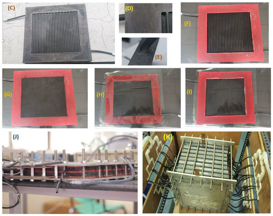 Details of the stack construction: (A) schematic of a redox flow battery, (B) manometer arrangement for in situ pressure-drop measurement in the stack, (C) graphite plate with serpentine flow field and inlet/outlet feed tubes, (D,E) details of arrangement of flow feed through a Viton tube inserted into the side of the graphite plate, (F) overlaying of silicone gasket overlaid on the graphite overheads, (G) filling of flow channel with carbon felt, (H) placing membrane over the plate and the electrode, (I) placing of another silicone gasket over the membrane to house the adjacent electrode felt, (J) assembled single cell and (K) integrated 8-cell stack with split manifold.