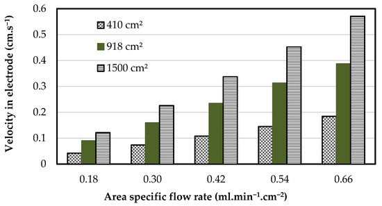 Our previous studies with serpentine flow fields on cells of 400 and 900 cm2 area [54,55,56] reported standard electrochemical performance for flow rate in the range 0.18 to 0.80 mL.min−1.cm−2 for current densities up to 120 mA.cm−2. The serpentine flow field, when attached to a porous substrate, exhibits certain desirable flow features that are beneficial for an electrochemical reaction occurring in the porous substrate [44,54]. The electrolyte, when introduced into the serpentine flow field, will split into two streams: one passing through the flow channels and the other passing through the porous substrate. Detailed computational fluid dynamics (CFD) simulations show that this split happens right at the inlet channel itself and the part going through the substrate will flow towards the outlet channel with partial mixing with the electrolyte flowing in the channels. The fractional flow split between the two parallel pathways depends on the flow resistances in each path and may vary in the range of 25 to 75% [45,51,54,56]. A predictive lumped parameter model was proposed based on CFD simulations and validated by using the experimentally measured pressure drop in single-cell studies of the similar sizes [54,56]. The velocity of the electrolyte in the electrode predicted by using this lumped parameter model [54] is shown in Figure 2 for the three cell areas as a function of area-specific flow rate, i.e., flow rate per unit active area of the cell. It may be noted that for the same area-specific flow rate, a large cell requires higher volumetric flow rate compared to a small cell. For example, for an area-specific flow rate of 0.3 mL.min−1.cm−2, cells of size 410, 918 and 1500 cm2 require electrolyte circulation rates of 123, 275 and 450 mL.min−1, respectively. Since the channel dimensions are the same for all three cell sizes, the pressure difference between adjacent channels will be higher and as a result higher amount of flow will go through the porous substrate for higher cell sizes at the same area-specific flow rate or for the same cell as the flow rate increases. Thus, we see from Figure 2 that electrode electrolyte velocity of about 0.2 cm.s−1 would be obtained at 0.66, 0.42 and 0.30 mL.min−1.cm−2 for the small, medium and large size cells, respectively.