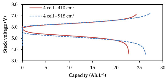 Voltage-capacity curves obtained during charge–discharge cycle test at operating current density of 75 mA.cm−2, flow rate of 0.37 mL.min−1.cm−2 on 4-cell stacks made with cells of size 410 cm2 and 918 cm2.