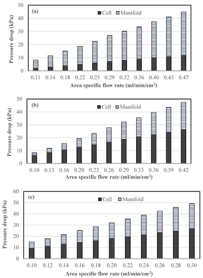 Measured pressure drop as a function of the area specific flow rate for (a) 16 cell—410 cm2 stack, (b) 8 cell—918 cm2 stack and (c) 8 cell—1500 cm2 stack. The contributions of pressure drop in cell and manifolds are marked separately. Note that the flow rate range for each stack is different.