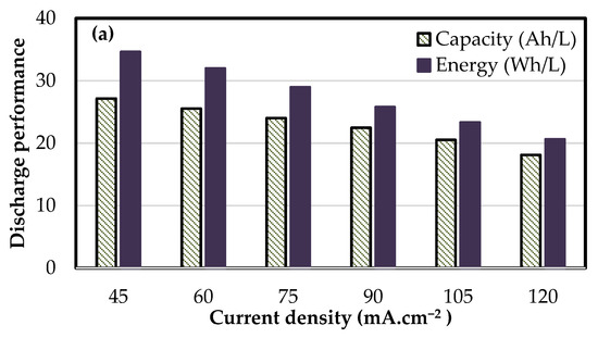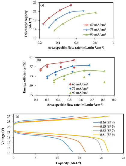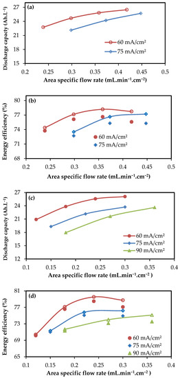 Similar experiments have been conducted in the stacks of configuration 8 cell—918 cm2 and 8 cell—1500 cm2, but in a lower flow rate window, and the results are plotted in Figure 6a–d. The trends of discharge capacity and energy efficiency with increasing flow rates are similar to those for the 16 cell—410 cm2 stack. Optimal circulation rate is found to be in the range of 0.4 to 0.5 and 0.25 to 0.35 mL.min−1.cm−2 for current density range of 60 to 90 mA.cm−2, respectively for the stacks fabricated with cell sizes of 918 and 1500 cm2. The good performance at lower area-specific flow rates in large cells is attributed to increased split of electrolyte to electrode resulting in sufficient velocity in the electrode at low specific flow rates itself [56]. The coulomb and voltage efficiencies of the investigated stacks are presented in Table 3 for the chosen operating conditions.