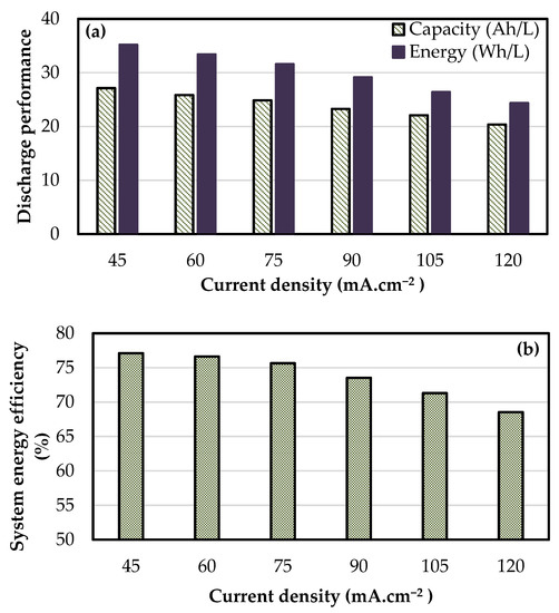 Electrochemical performance of 8 cell—918 cm2 stack at different current densities at a constant electrolyte flow rate of 0.36 mL.min−1.cm−2: (a) discharge capacity and energy density and (b) system energy efficiency.