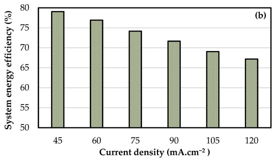 Irrespective of the cell size, the optimal flow rate is found to change with current density to some extent. This would imply that in a dynamic situation where the power at which the battery needs to be charged or discharged changes with time, there is a need to dynamically vary the circulation rate even if the battery was to be operated at a constant stoichiometric factor. Variable flow rate strategy requires dynamic measurement of changes in power levels and SoC of electrolyte. In addition, most pumps have a limited range of parameters in which the pumps operate at high efficiency. If there is a fixed flow rate which can give good performance for a range of current densities, the life of the pump can be increased and complexity in online measurement of dynamic power and SoC can be reduced. In view of this, charge–discharge tests were conducted in the stacks (8 cell—918 cm2 and 8 cell—1500 cm2) at a fixed flow rate of 0.36 and 0.30 mL.min−1.cm−2, respectively, for various current densities in the range of 45 to 120 mA.cm−2. At each current density, three charge–discharge cycles were conducted and the average of the three is reported in Figure 8 and Figure 9. The stack 8 cell—918 cm2 exhibited specific discharge capacity in the range of 27 to 20 Ah.L−1, energy density in the range of 35 to 24 Wh.L−1 with system efficiency in the range of 77 to 69% for current density in the range of 45 to 120 mA.cm−2 at a fixed flow rate of 0.36 mL.min−1.cm−2. The corresponding values for the stack 8 cell—1500 cm2 are 27 to 18 Ah.L−1, 35 to 21 Wh.L−1 and 79 to 67% at the lower fixed flow rate of 0.30 mL.min−1.cm−2. For current densities of up to 75 mA.cm−2, both the stacks have given equal performance, but at higher current densities, the large cell stack gave marginally lower performance due to higher ohmic over-potentials arising from high current values and high rate of depletion of active reactant with low replenishment compared to 918 cm2 cell size. Taken together, these results show that at close to the optimal flow rate conditions, a stack can be operated at ±25% rated power without affecting the electrochemical performance in a significant way. For variations of ±50% from the rated power, there is an appreciable change; however, the degradation in performance is not too severe in terms of efficiency. In a low pressure drop stack such as the present one, constant flow rate operation is therefore possible for integration with renewable energy sources and dynamic power demands.