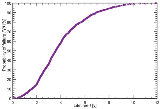The development of the failure rate in Figure 5 shows a moderate exponential increase. The shape parameter b = 2.812 clearly belongs to the ageing effects, which are characterised by a shape parameter . With the knowledge of the ageing mechanism Plates and Grids from Section 3.4, the curve in Figure 5 is understandable. When the battery is not in use, only minor ageing takes place. Only with increasing time and use of the battery does the ageing effect become apparent and eventually lead to a failure of the battery due to increased internal resistance. The allocation of the failure mode Plates and Grids to the gradual faults is suitable for the curve according to Figure 5, resulting from the shape parameter b.