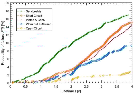 The major five failure modes found by BCI are shown for the total sample. The individual probability of failures F(t) is displayed for a time period of 4 years [].