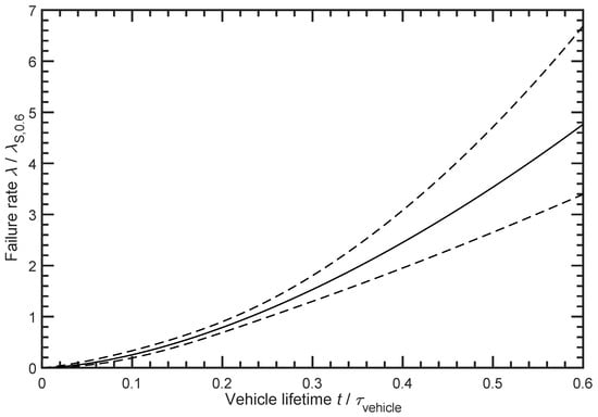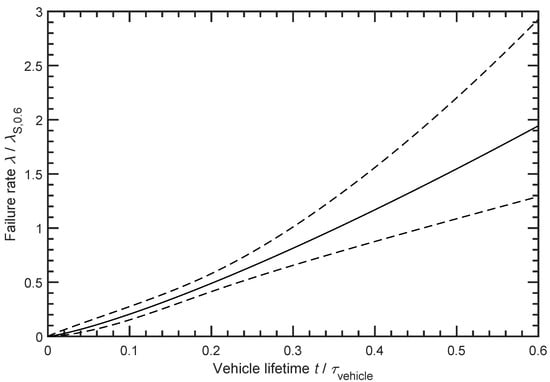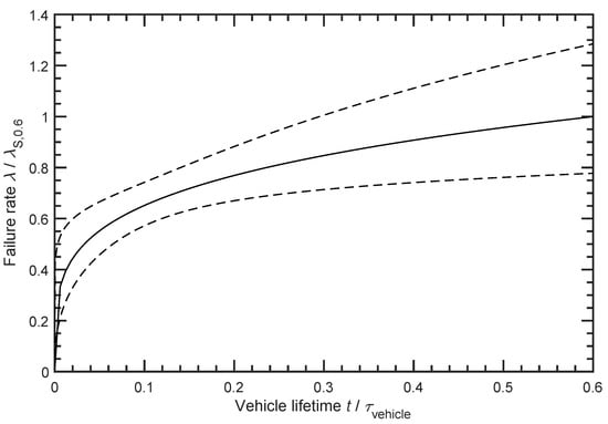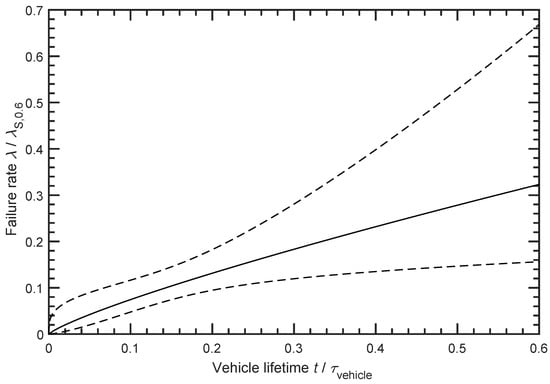 Nevertheless, the older database is used to demonstrate the methodology from Section 2, but the absolute failure rates are not relevant for the reasons mentioned above. The Weibull parameters are presented, but the scale parameter T is normalised with respect to a typical vehicle lifetime. Subsequently, the calculated time-dependent failure rates are also presented normalised. The time is normalised with respect to a typical vehicle lifetime . The failure rates of the individual failure modes from Section 3 are normalised to the failure rate of the still functional batteries of the failure mode Serviceable after vehicle lifetimes according to the following Equation (8):