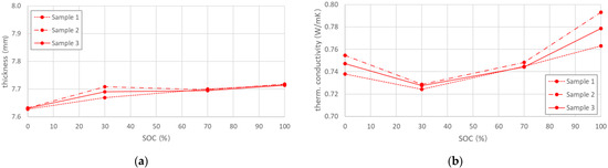The through-plane thermal conductivity was determined for four different SOC levels on three fresh batteries. It was calculated from the steady state values of the temperature difference and heat flux in combination with the results of the thickness measurements (see Appendix A), conducted according to the method described in Section 4. Figure 1a provides additional information on the thickness change with battery SOC. Each point on the presented curves represents an arithmetic mean value of the thickness, measured at twelve different locations on the surface of each cell. The test data showed an overall thickness increase with state of charge, where a thickness difference of approx. 1% was determined between fully charged and fully discharged cells.