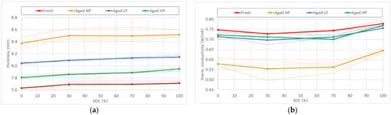 In order to assess the influence of product life onto the thermal conductivity of LIBs, measurements were performed on differently aged cells. The respective ageing procedures are described in detail in Section 4. Results of the conducted tests can be seen in Figure 2. An overall thickness increase for aged cells over the whole SOC-range was determined (Figure 2a). A similar trend however was observed to that of fresh batteries, where a difference in thickness of about 1% was evaluated between fully charged and discharged cells. The total amount of irreversible swelling was shown to be also dependent on the compression force applied to the component stack during ageing. Cells, cycled without pretension, experienced a thickness increase slightly higher than 10%. For the typical pretension of 0.06 MPa, the value of total cell expansion was only about half as much. In the case of high pretension during cycling, the rise in cell thickness was determined to be in the order of 3%. The measured thickness values for each investigated SOC were used for the calculation of the thermal conductivity of aged batteries.
