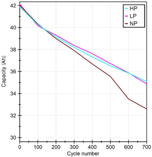 End criterion for each ageing strategy was set to 700 cycles in order to ensure comparability of the results. Every 100 cycles the discharge capacity was determined (Figure 3) in order to keep track of the state of health changes with ageing. This was achieved by integrating the charge taken out of battery when discharging the cell from a fully charged state to its lower voltage limit. The capacity loss curves, seen in Figure 3, represent the calculated mean value out of ten individual cells.