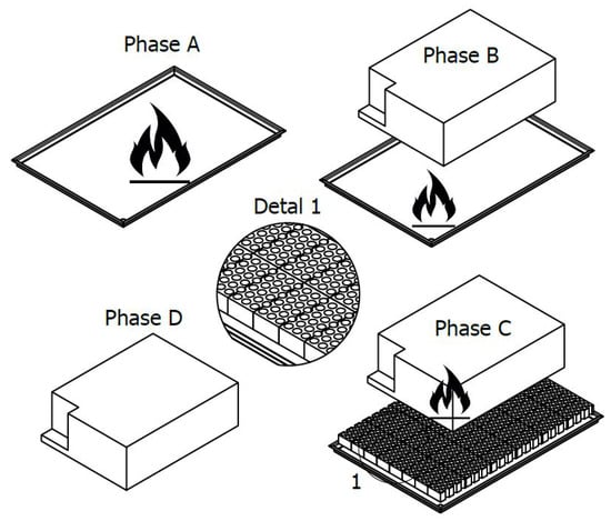 The main purpose of a fire resistance test is to evaluate the resistance against heat exposure propagated by fuel spills and ensure the driver and passengers have enough time to evacuate. The exposure of RESS to fire during the test is provided by positive-ignition engine burning under atmospheric pressure. The specimen is engulfed in flames for a given time period and then observed for any signs of explosion. The test procedure, shown in Figure 1 and listed in Table 2, comprises four phases. During phase A, fuel is freely burning with the RESS being at least 3 m away from the fire source. In phase B, the battery is directly exposed to flame. Next, during phase C, the fire source is moderated by a screen of perforated bricks composed of refractory material. In the last phase, D, the battery is removed from fire source to the initial position and observed until the surface temperature of the specimen decreases to ambient temperature or has been decreasing for a minimum time of 3 h.