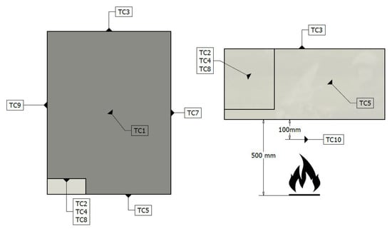 The experimental analyses were performed on a complete rechargeable energy storage system with the following dimensions: 110 cm long, 80 cm wide, and 40 cm high, which was composed of lithium titanium oxide (LTO) cells and a lagging system. The SOC value was set to 51% of the normal operating range prior to the test. No active protection devices were present for the test. For temperature distribution measurement, 10 thermocouples (denoted TC1–TC10) were mounted on the outer surface of the battery. The exact thermocouples locations are described in Table 3 and shown in Figure 2. All thermocouples, except for TC6, were fixed using square-shaped gypsum pads with adhesive to isolate the measuring tip from environmental influences and to measure solely the surface temperature []. Type K (NiCr-Ni) thermocouples used in the test were calibrated to class 1 accuracy according to DIN EN 60584-2, which corresponds to an error of C at 900 C. A DataTaker logger with checked measuring path was used as a data acquisition center for thermocouples with a sampling interval of 3 s. Expanded uncertainty for the whole temperature measurement was established as C.