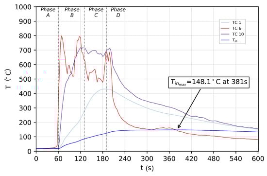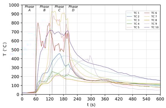 where subscript TC is related to he thermocouple, and index 1–10 denotes its location; superscript P indicates the phase of the test according to Table 2. Table 4 shows the maximum recorded temperature at every thermocouple in each phase. Analogously, the average temperature and standard deviation during each phase was determined using the following equations