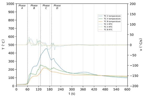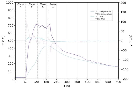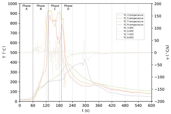In addition, for all thermocouples, the rates of temperature change (RTC) and their maximum values were respectively determined using the following formulas