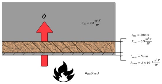A simplified one-dimensional model, see Figure 7, of heat transfer inside the RESS was constructed to estimate the temperature of the battery’s interior and then to evaluate if the cells might have reached the critical point in comparison with known data during the fire test. For this purpose, one assumed that heat was transferred only by the bottom division and the battery was airtight with a specific amount of internal air. Heat flux was moderated with a 5 mm thick steel casing and 20 mm thick insulation material . In reality, the exact material used for the RESS lagging is a trade secret of the RESS manufacturer.