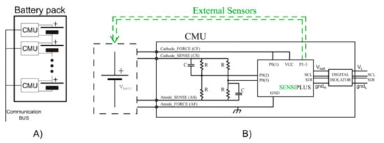 This work is organized as follows: in Section 2, the SENSIPLUS chip is introduced together with the Printed Circuit Board (PCB) that supports the SENSIPLUS and forms the proposed CMU; in the same section, two examples of external sensors that can be managed by the CMU are also described. In Section 3, the results of measurements performed with the proposed system are presented; these measurements include both tests involving the sensors and EIS acquisitions performed on a commercial LiPo (Lithium-ion Polymer) cell. Finally, in Section 4, conclusions are drawn.