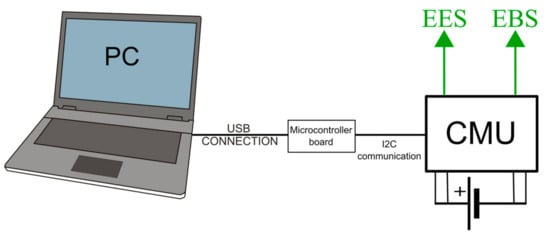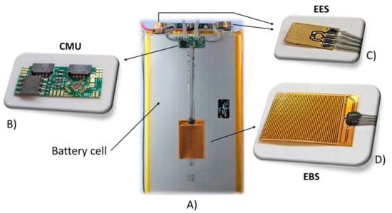 An example of the cell measurement setup is shown in Figure 2. The system includes the custom PCB (named CMU in the rest of the paper), two external sensors applied to the cell electrodes (External Electrode Sensor—EES), and the external sensors applied to the body of the cell (External Body Sensor—EBS).