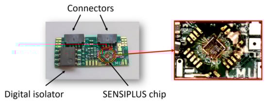 The CMU, whose schematic view is shown in Figure 1, consists of a Printed Circuit Board of size 20 × 8 mm2. A photograph of the CMU is shown in in Figure 3, where the digital isolator and the connectors to the communication bus are indicated. External sensors and the cell under test are connected to the CMU by wires directly soldered to proper pads of the PCB. The SENSIPLUS chip is directly glued to the CMU board as a naked die, while bonding between the chip and PCB pads is accomplished by means of wire bonding. Bonding wires are protected by a resin ring that leaves the central part of the chip uncovered, where on-chip sensors are placed. A magnification of the CMU area where the chip is placed is shown in Figure 3.
